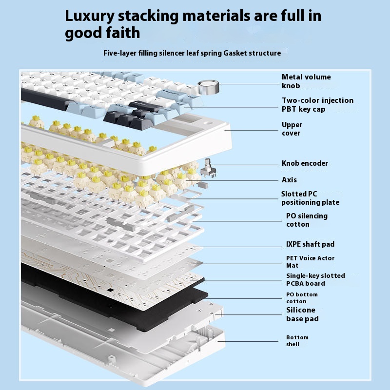 Estructura Gasket Mount con 5 capas de amortiguación para el sonido 'thock' perfecto. Switches pre-lubricados de fábrica y teclas PBT de doble inyección ultra-resistentes.